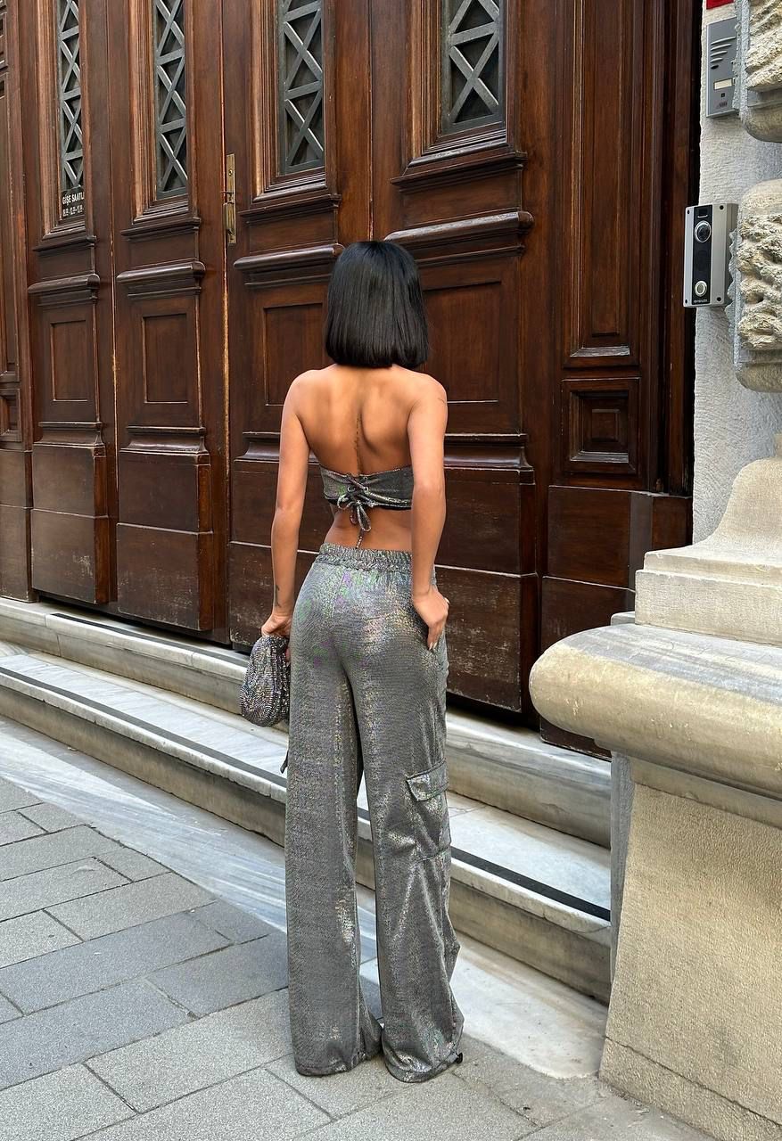 Compleu din două piese cu top și pantaloni în nuanța silver. Material sclipitor, ideal pentru apariții de seară cu efect garantat.