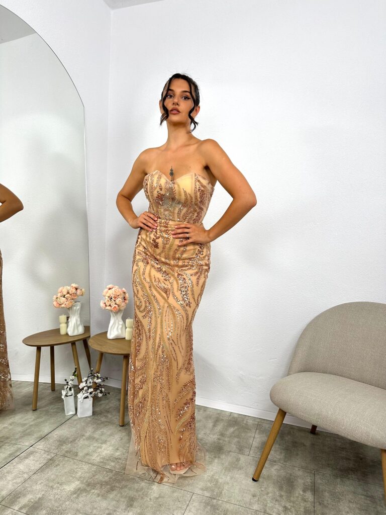 Rochia Caramelle atrage toate privirile prin nuanța sa metalică. Croiala fluidă și detaliile fine îi oferă o eleganță atemporală, perfectă pentru evenimentele speciale unde vrei să strălucești.