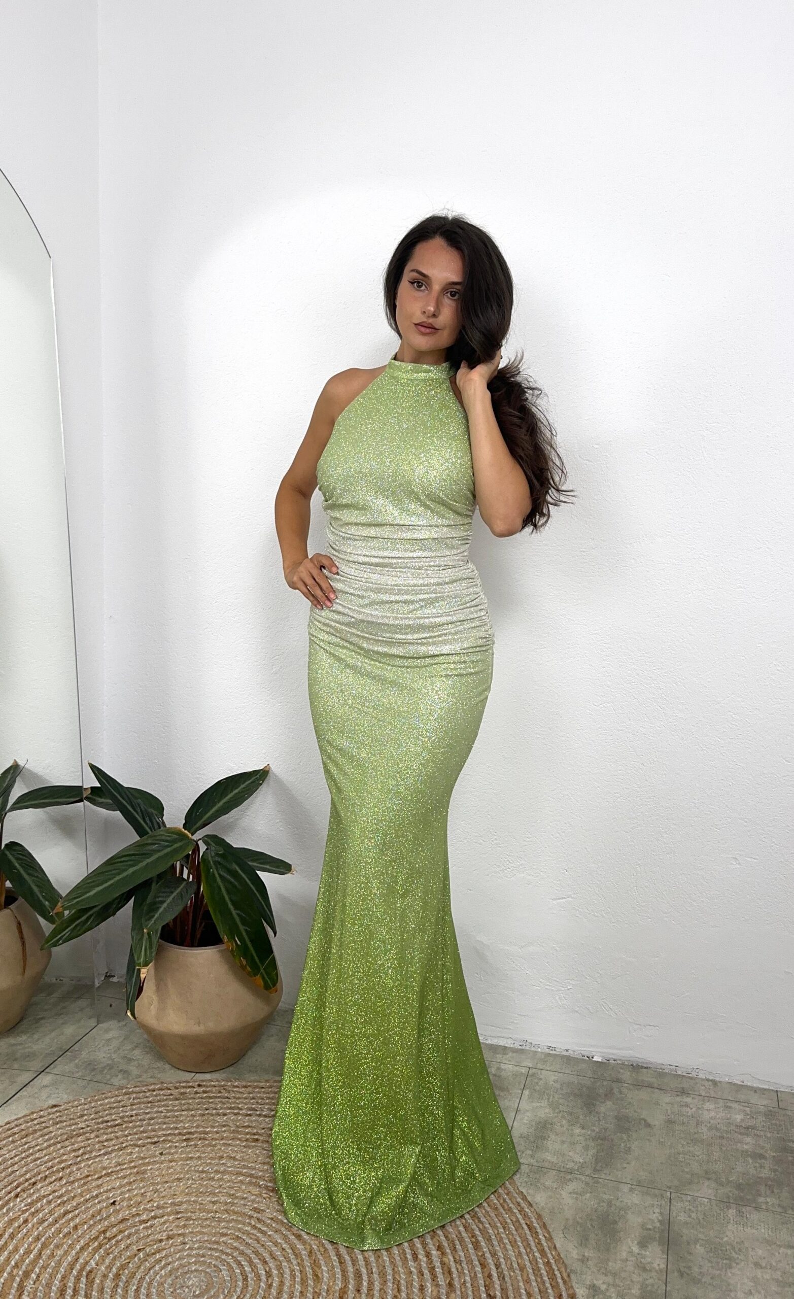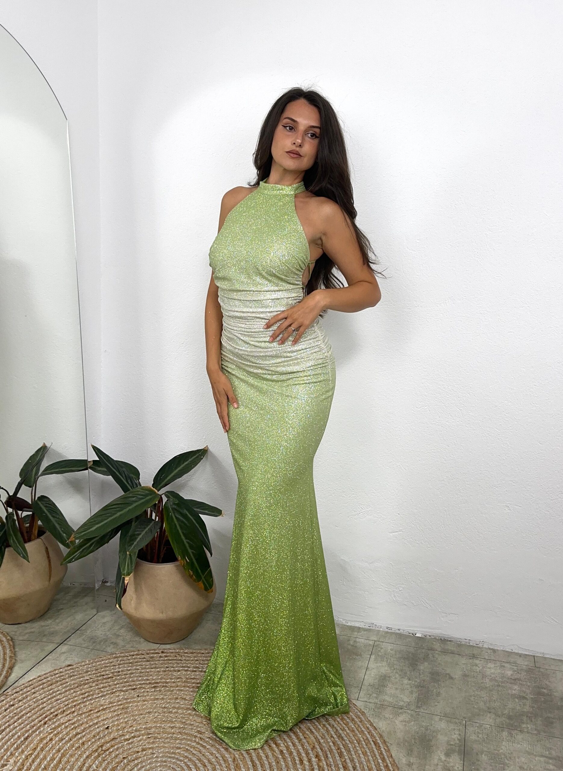 Lungă, fluidă și cu un croi care pune în valoare silueta, rochia impresionează prin nuanța intensă de verde cu degrade ombre alb și sclipiri subtile care captează fiecare rază de lumină. Se prinde pe gât, lăsând spatele complet gol pentru un efect seducător și elegant. Este o piesă statement, ideală pentru evenimente speciale, gale sau petreceri de seară.